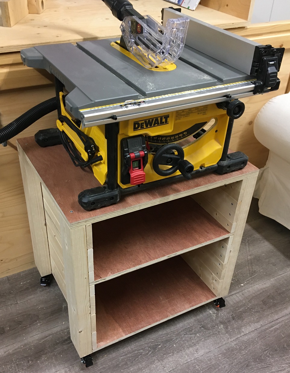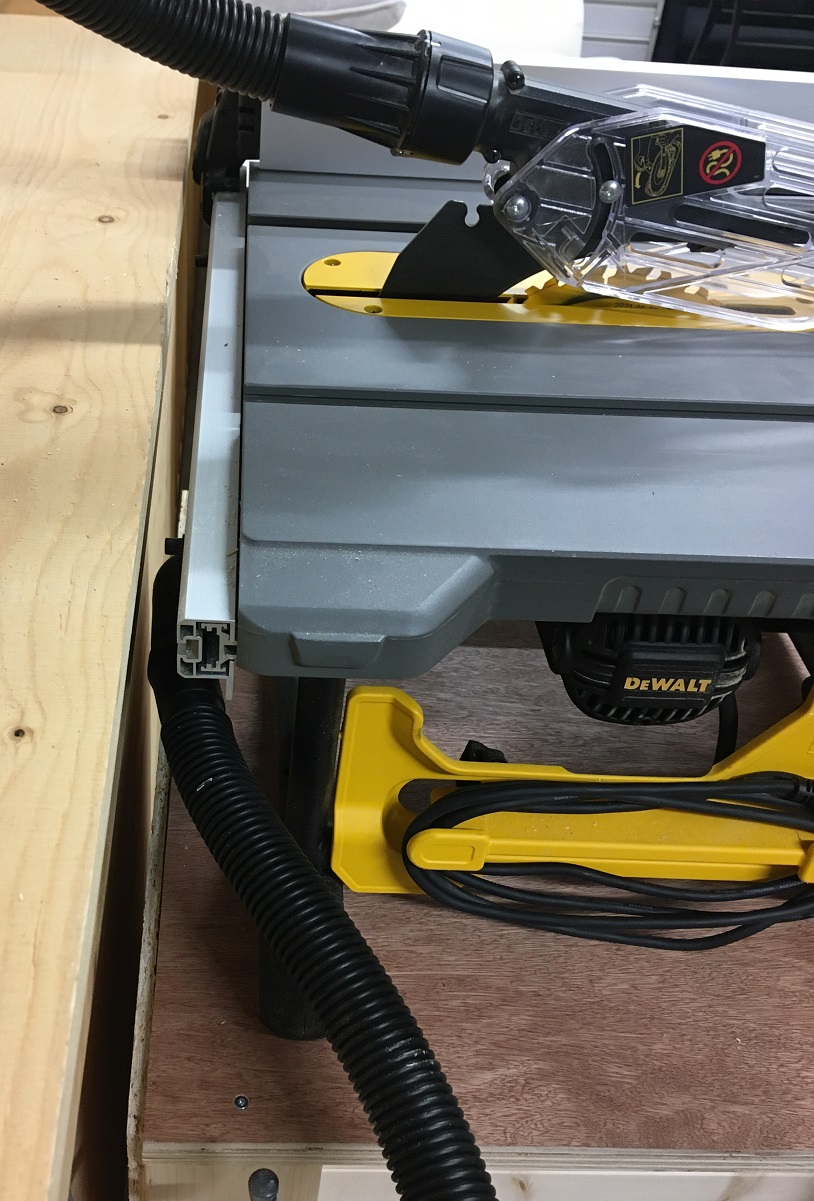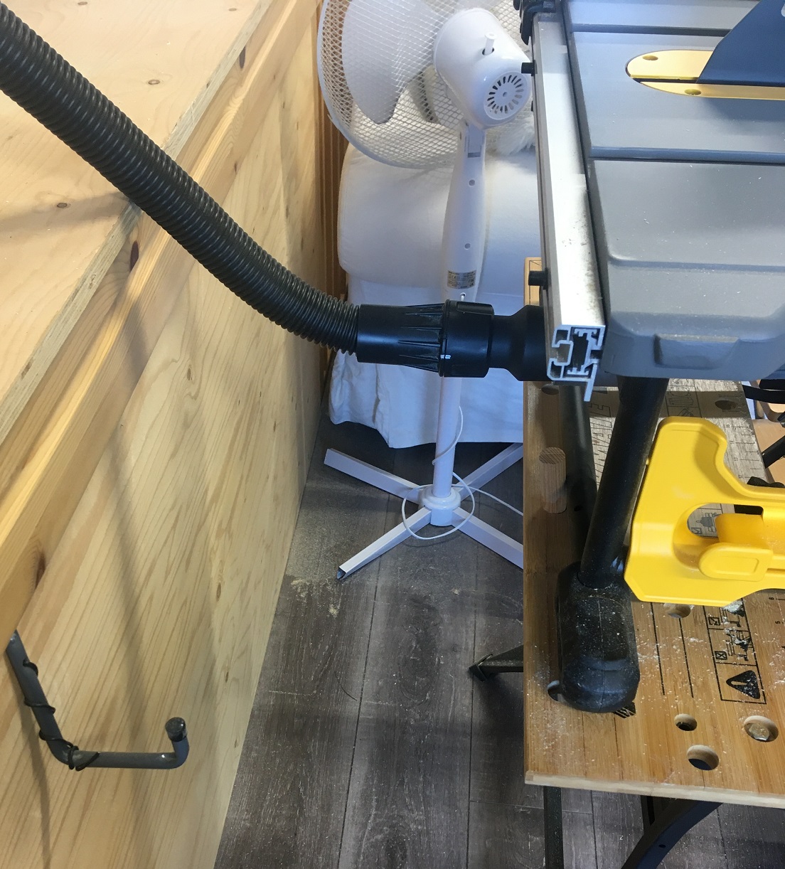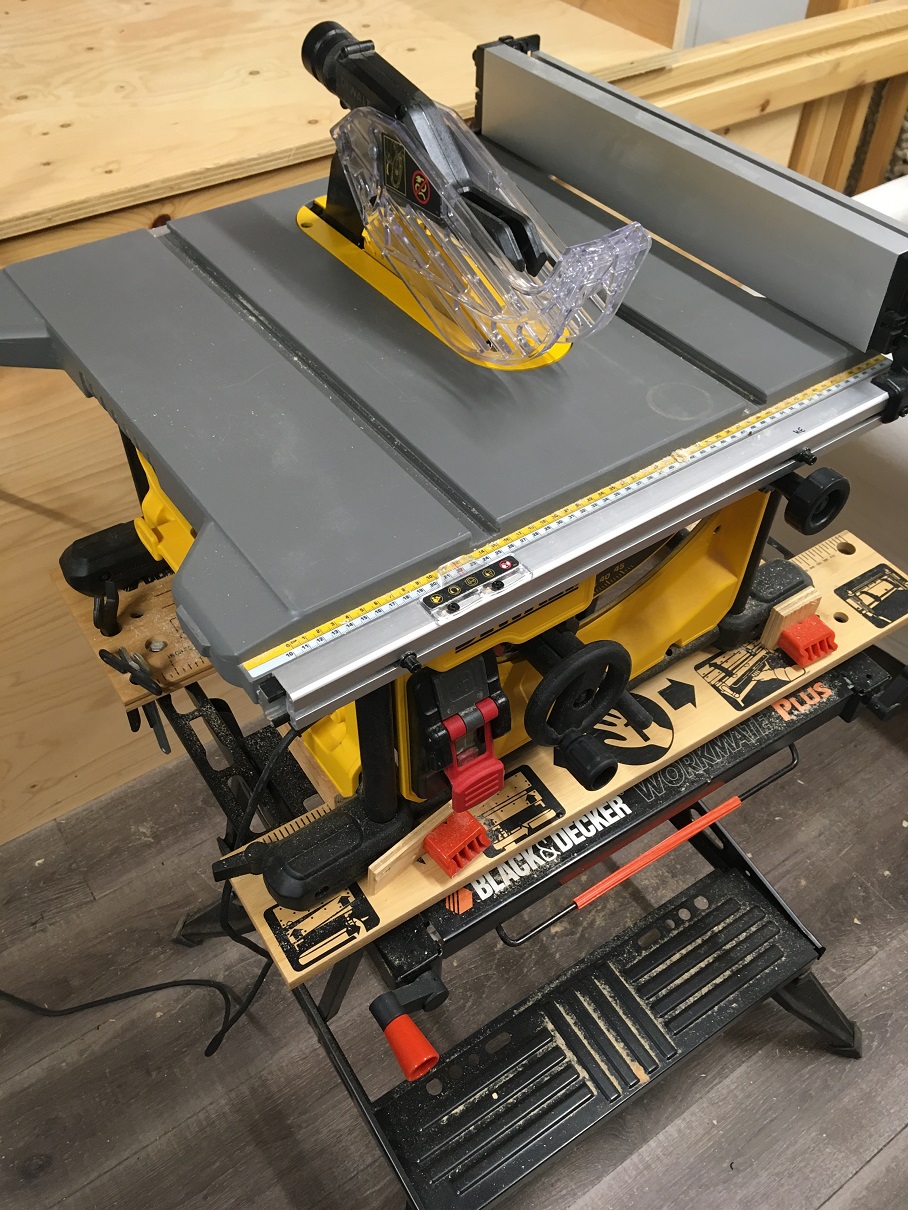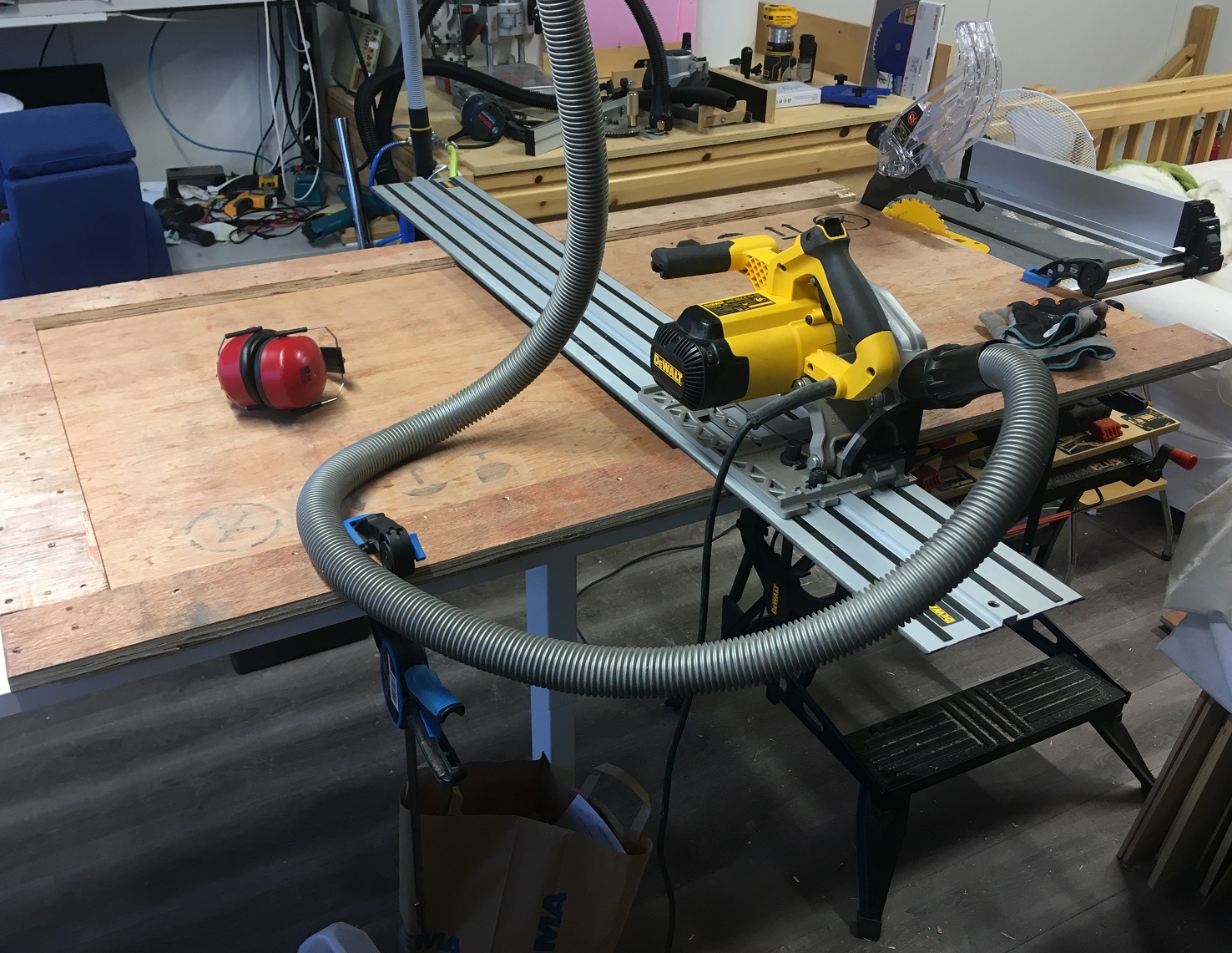 Lähtökohta, saha DWE7485 perus työpenkillä. Ei säilytystilaa, liian korkea, taso liukas. |
