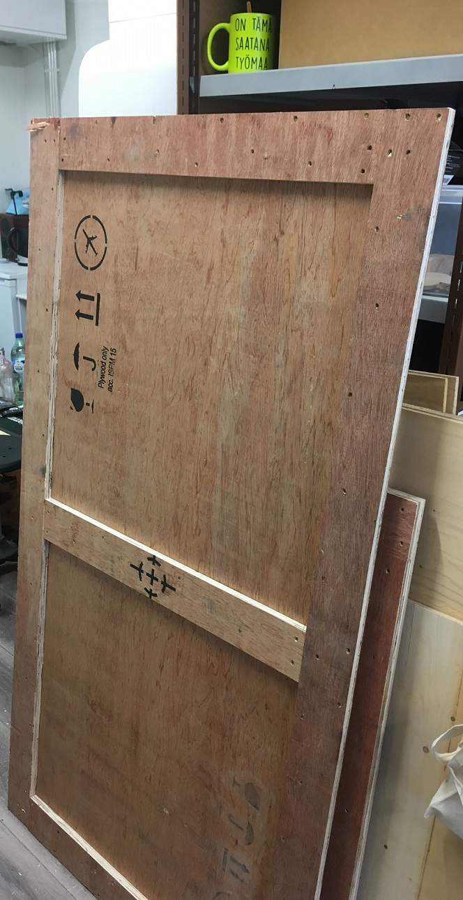Ison kuljetuslaatikon seiniä, punertavaa laadukasta vaneria. |